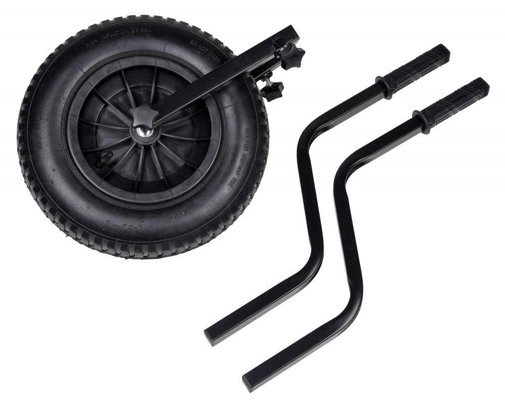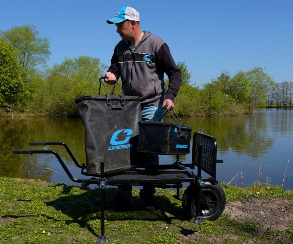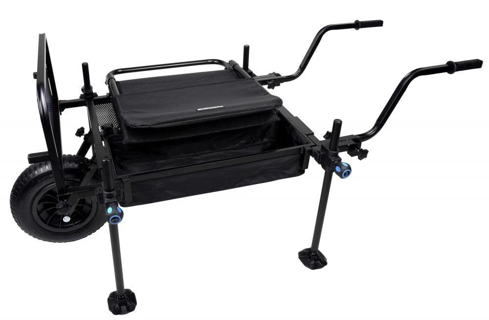 The barrow system features a large air tire (36 cm diameter) and 2 robust levers in the correct length, equipped with rubber handles. The barrow system is perfectly balanced and easy to steer, so that the walk over bumpy or soft surfaces is no problem at all. The included metal bait table offers space for numerous accessories and bait types in a horizontal position. Placed in a vertical position, this bait table forms a raised edge against which a bag or other items can be placed for safe transport.