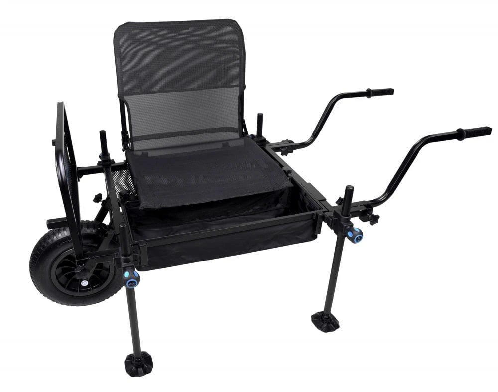 This Blackthorne Barrow seat combines the comfort of a chair with the stability of a seat box or platform and also has a barrow system with integrated side platforms. This makes the Barrow seat ideal for anglers who want to assemble their equipment compactly and mobile in order to make remote cuttings comfortably accessible.
