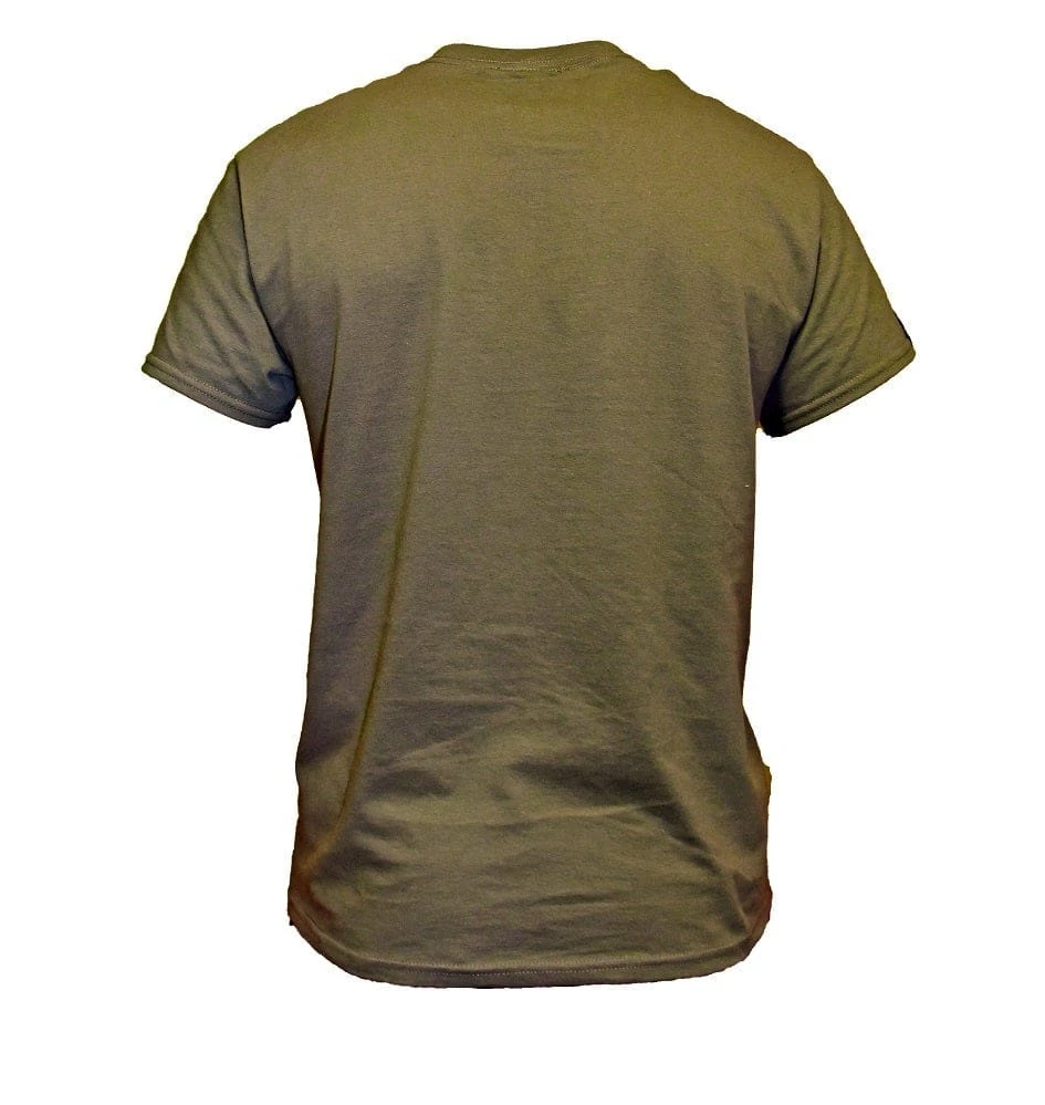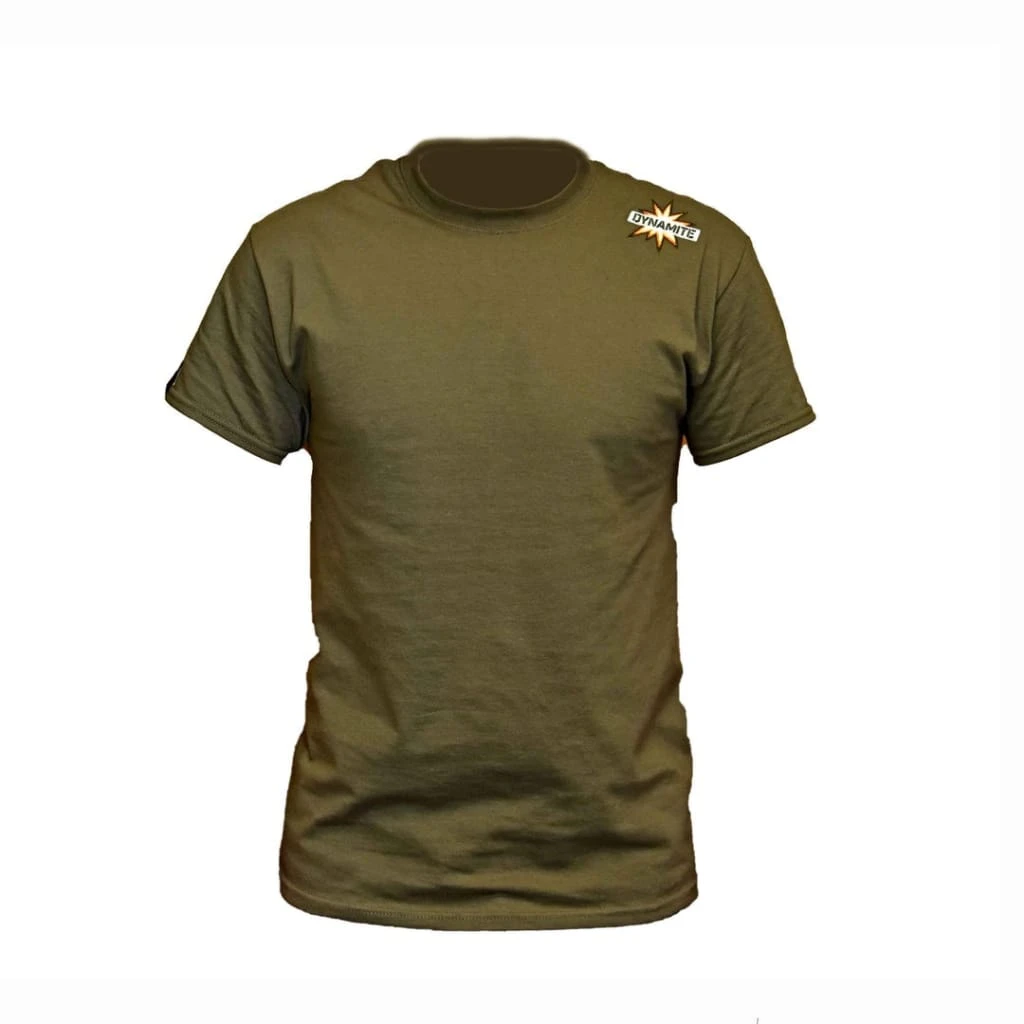 Khaki green, carpy T-shirt with embroidered Dynamite logo on left-shoulder and orange DYNAMITE tag on right-sleeve.