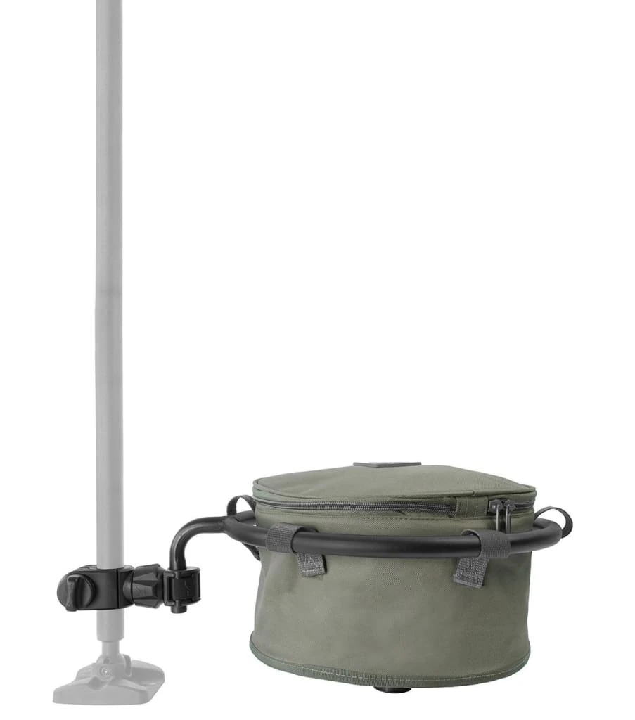Features a collapsible nylon-lined 600D Oxford groundbait bowl complete with zipped lid, mounted on a frame that incorporates the Any Chair knuckle.