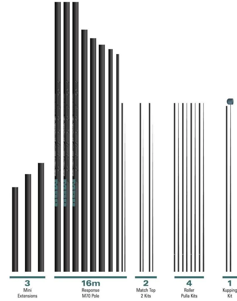 The M50 has a total of seven kits, whichever kit is fitted the pole will always be the same length ensuring accurate feeding and rig placement. To further optimise performance EVA elastic alignment cones with PTFE bushes are supplied for every top kit and this pole features section alignment arrows for maximum efficiency.